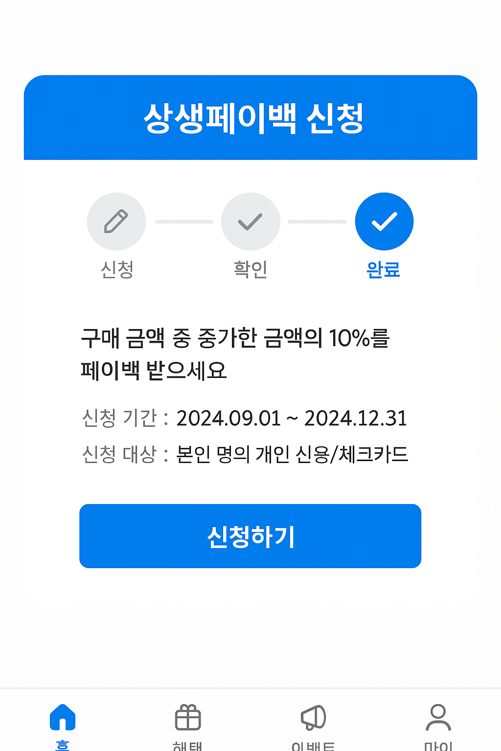 신청은 생각보다 간단합니다. ✅ 보통 카드사 홈페이지나 앱에서 “상생소비지원금” 또는 “상생페이백” 메뉴를 통해 가능합니다.